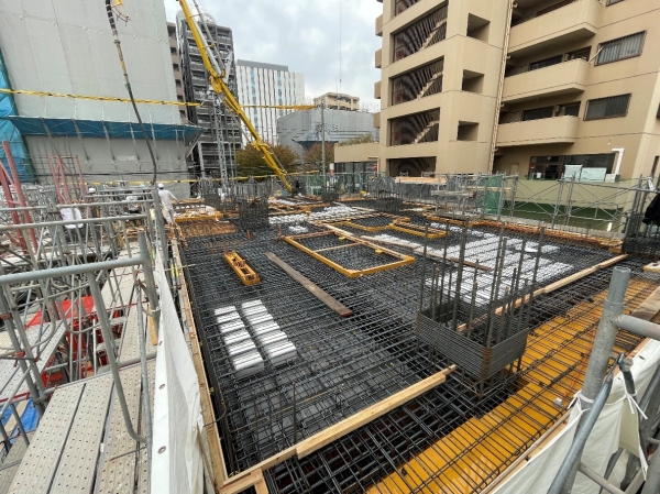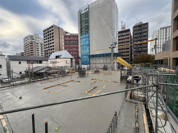 <モントーレ六本松ザ・マーク> 第4回報告書 4階躯体(5階床)配筋工事/4階躯体(5階床)配筋検査/4階躯体(5階床)コンクリート打設/5階躯体(6階床)配筋工事/5階躯体(6階床)配筋検査/全景