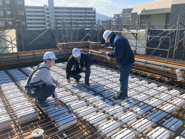 設計監理者による4階躯体(5階床)配筋検査状況です。