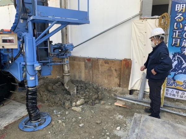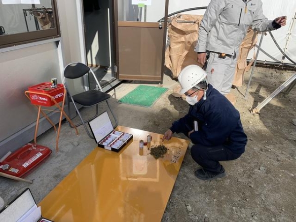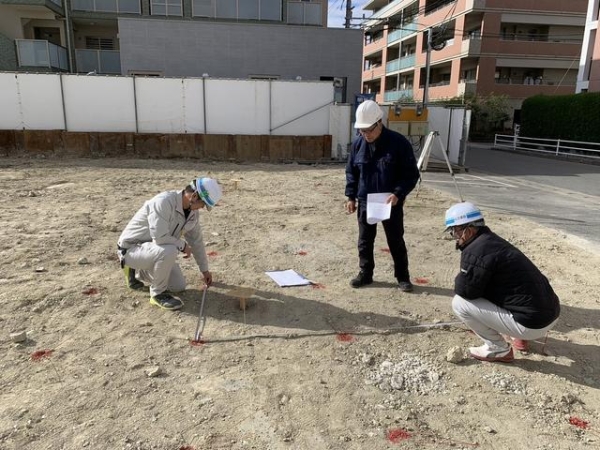 設計監理者による建物配置確認・杭芯確認検査の状況です。
