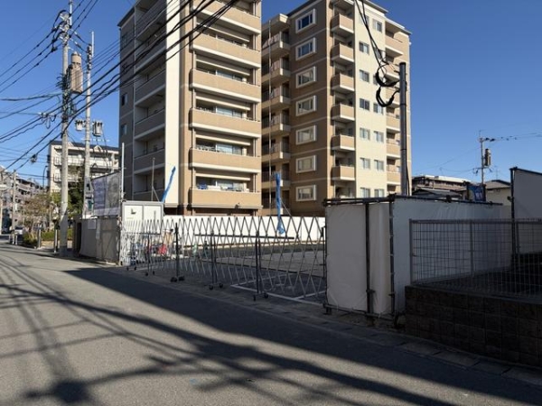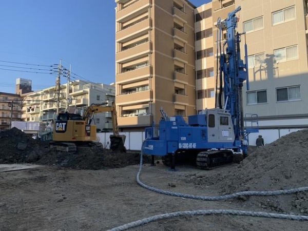 <モントーレ室見リバーサイド> 第1回報告書 安全祈願祭/土留め工事(H鋼鉄板連続壁工法)/土留め工事(地中連続壁工法)/建物配置・杭芯確認検査/試験杭・支持地盤確認検査/基礎下地盤改良工事/全景